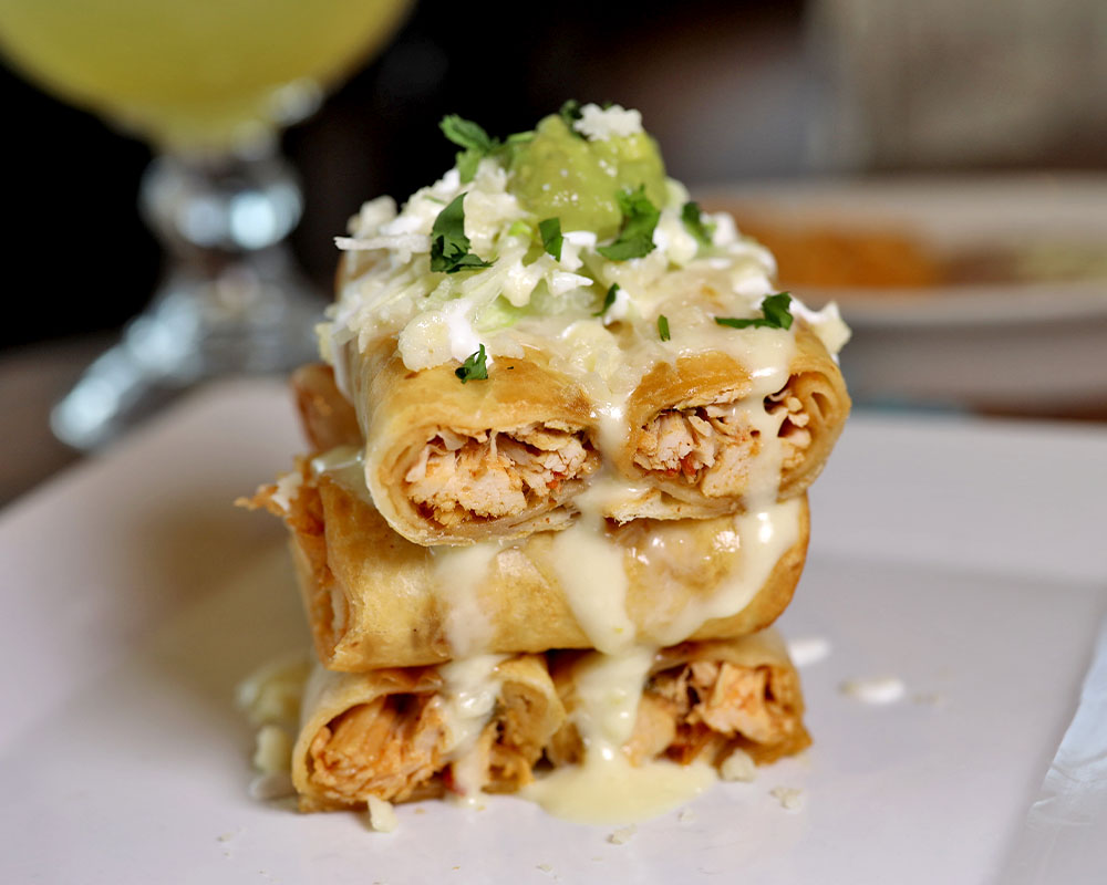 Three Anaheim peppers stuffed with ground beef, shredded chicken, or potato. Topped with shredded cheese.