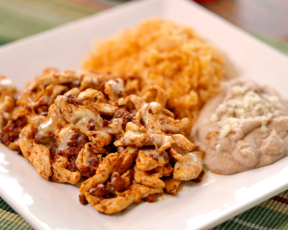 Grilled chicken strips with Mexican chorizo topped with cheese sauce. Served with Spanish rice, refried beans and flour tortillas.